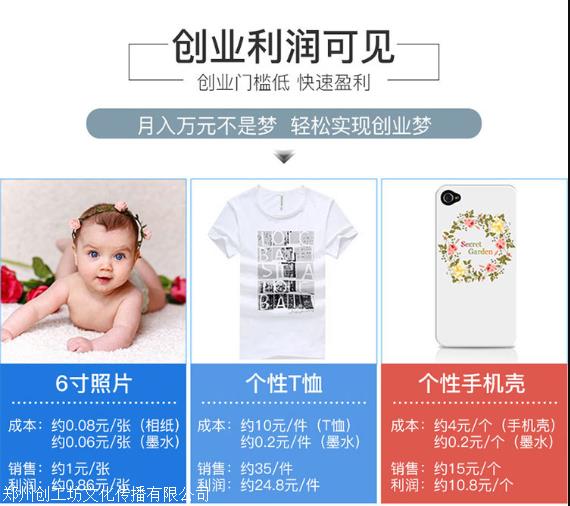 鄭州創工坊是一家提供衣服印照片設備,衣服印照片機器廠家。公司提供設備品類齊全,功能豐富。,一件也是批發價。購買衣服照片打印機設備公司可免費提供技術服務,一對一技術指導。并長期提供后期衣服,抱枕,手機殼等原材料。